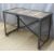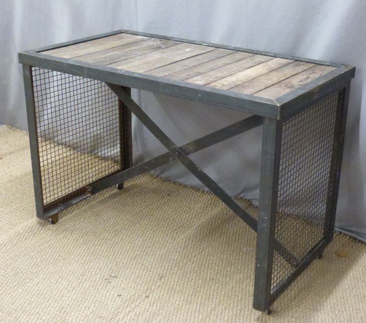Industrial/ shopfitting/ haberdashery Superdry display stand/ table with oak plank top, hanging rails and mesh either end with X support. W165 x D70 x H127cm