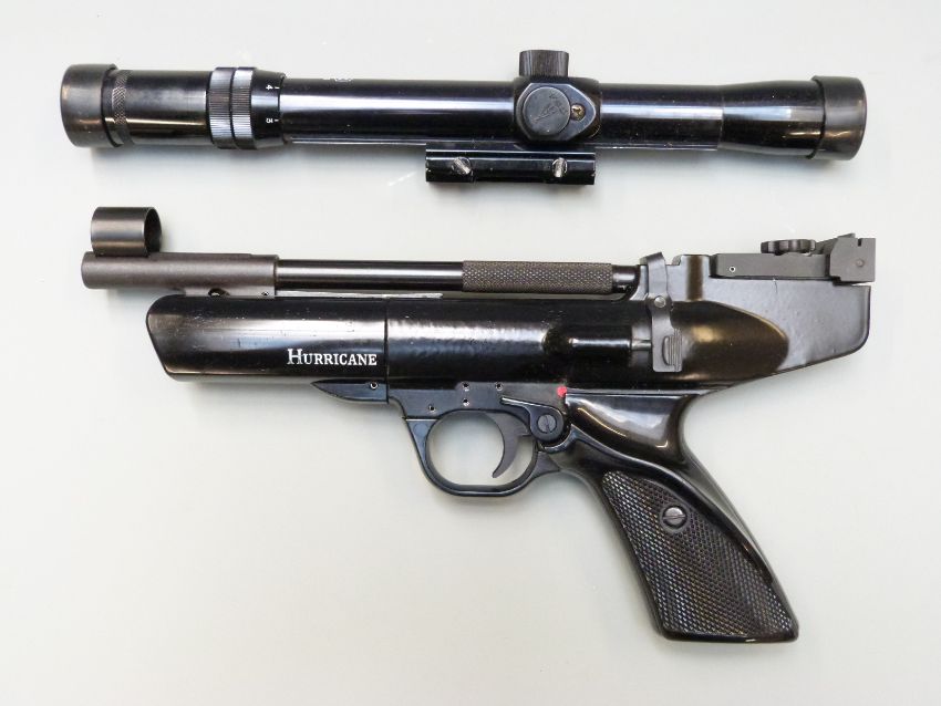 Webley Hurricane .22 air pistol with shaped and chequered grips, BSA 3-7 x 20 scope and accessories, in fitted leather carry case with targets and pellets
