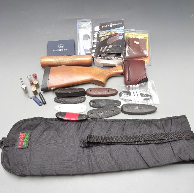 A collection of shotgun parts and accessories including a stock and forend for a Remington semi-automatic shotgun, snap caps, comb raising kit, butt pads, roll up gun slip etc.