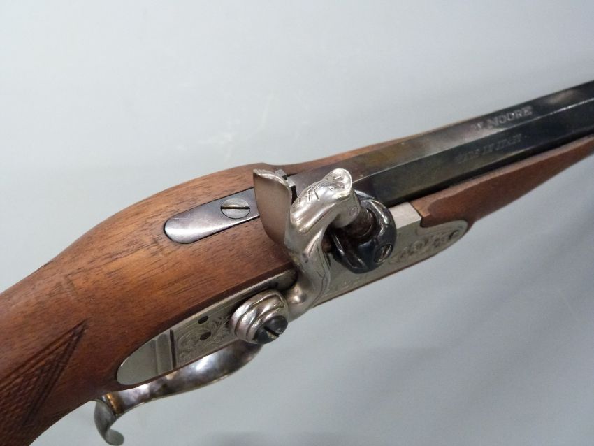 Italian William Moore style .45 calibre target pistol with lock engraved 'London', chequered grip, spurred trigger guard, adjustable trigger and 10 inch octagonal barrel engraved W Moore, overall length 39.5cm, serial number M47764. PLEASE NOTE THAT A VALID RELEVANT FIREARMS/SHOTGUN CERTIFICATE IS REQUIRED TO HANDLE/PURCHASE THIS ITEM.
