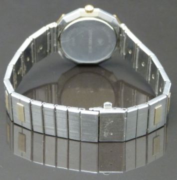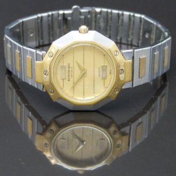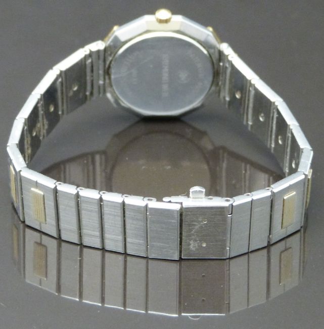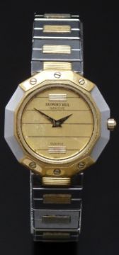 Raymond Weil ladies wristwatch ref. 8033 with gold dauphine hands, striped gold dial, faceted bi-metal case and quartz movement, on bi-metal bracelet, case diameter 22.5mm.