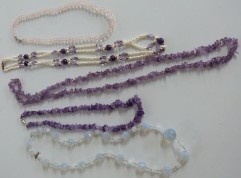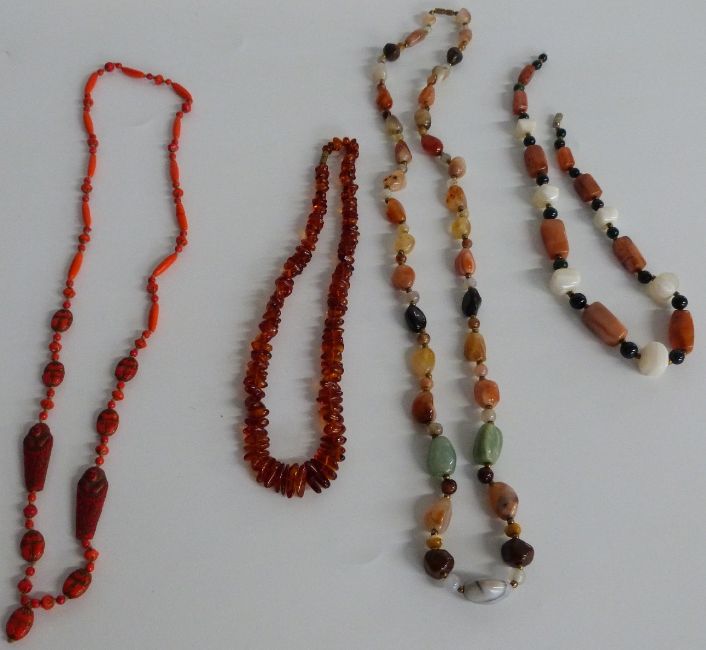 A collection of beaded necklaces including Egyptian, amethyst, agate, etc