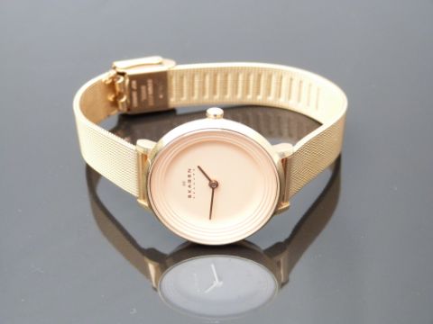 Skagen Ditte gold plated ladies wristwatch ref. SKW2213 with gold hands, peach dial, gold plated case and quartz movement, on gold plated mesh bracelet, case diameter 30mm, serial number 2471407, in original box with tag and booklet.