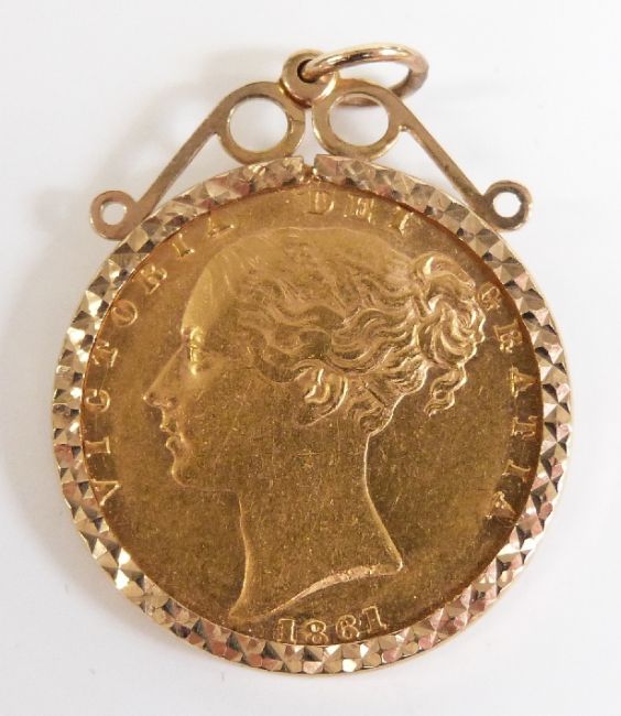 1861 gold full sovereign, Victoria young head, in 9ct gold mount, 9.1g