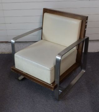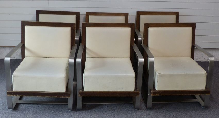 Set of six retro brushed stainless steel and wooden framed designer armchairs with white leatherette upholstery