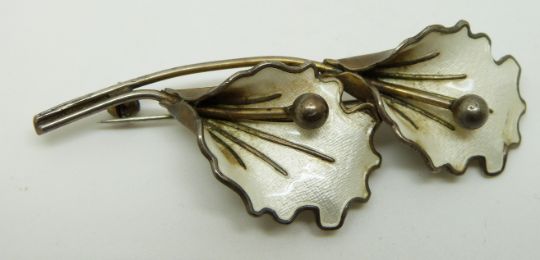 Norwegian silver brooch set with white enamel in the form of two flowers, length 7cm