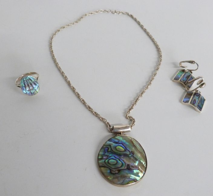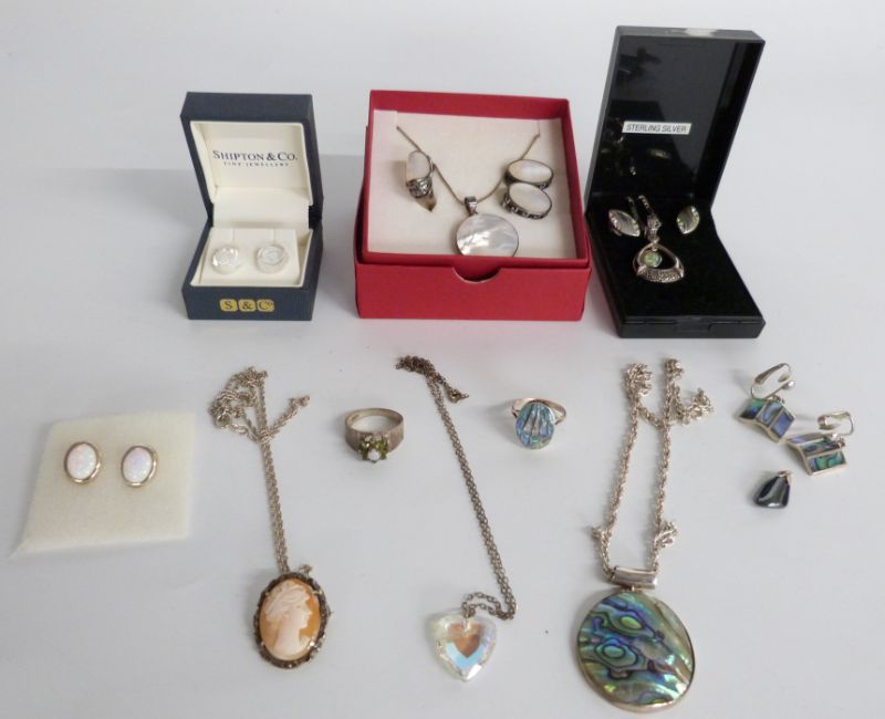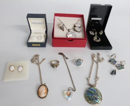 A collection of silver jewellery including a suite of abalone jewellery, mother of pearl suite of jewellery, opal earrings, silver ring, cameo etc