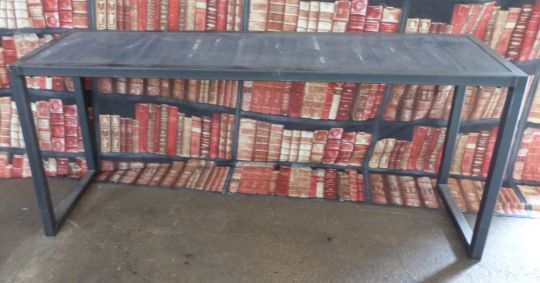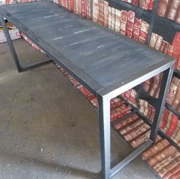 Industrial/haberdashery/shopfitting steel and plank topped narrow trestle style table, W 175 x D 50 x H 75cm