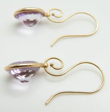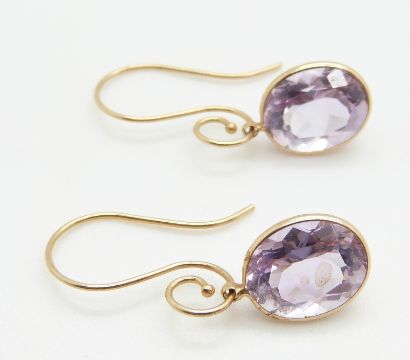A pair of 14k gold earrings set with an oval cut amethyst to each