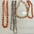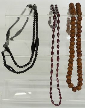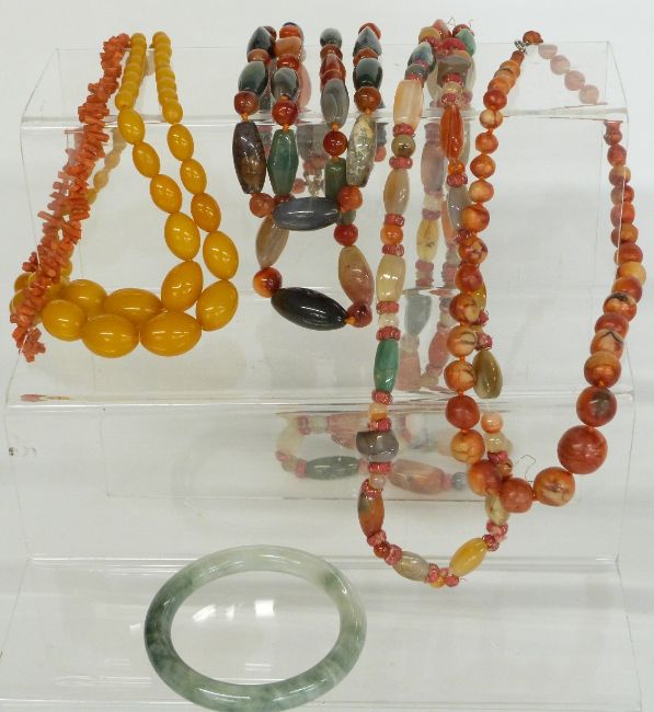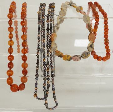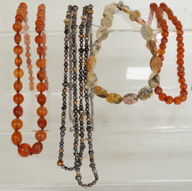 Art Deco French jet necklace, four agate necklaces, a pearl necklace, two coral necklaces, etc in a Japanese lacquer box