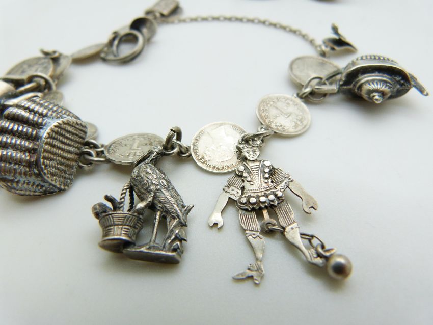 A silver Maundy bracelet set with silver charms, Victorian silver buttons, silver thimble etc