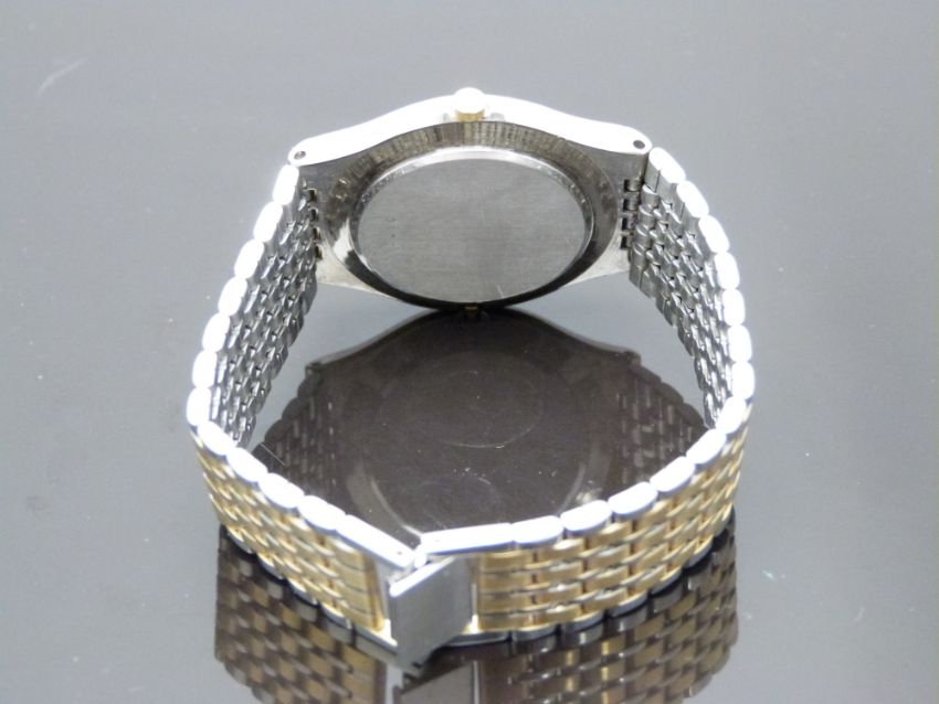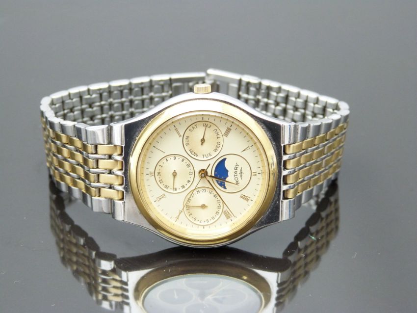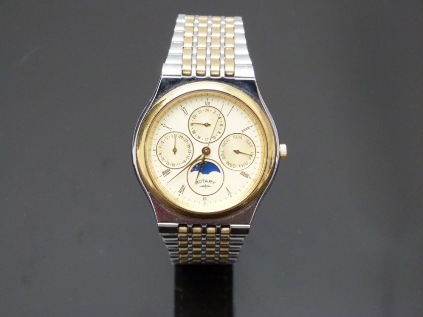 Rotary triple calendar gentleman's wristwatch with inset day and date dials, moonphase, gold Roman numerals, gold bezel, stainless steel case and quartz movement, on bi-metal bracelet, case diameter 34mm, serial number 3577, with F Hinds lifetime battery replacement guarantee.
