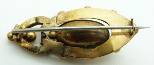 Victorian Etruscan Revival yellow metal brooch set with a pearl to the centre surrounded by a blue enamel star, 3.6g, 4 x 1.4cm