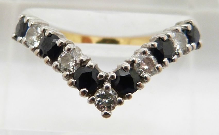 An 18ct gold ring set with sapphires and diamonds in a V shaped setting, 3.3g, size N