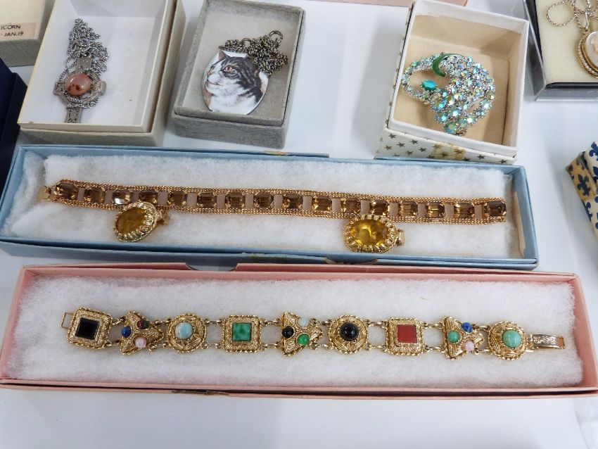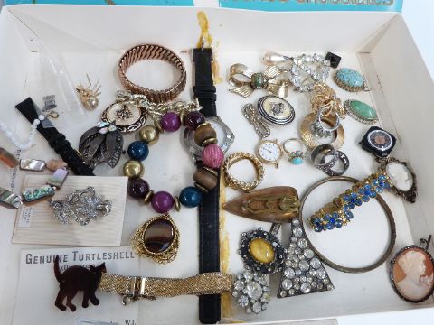 A collection of costume jewellery including 9ct gold cased ladies Rotary watch, silver ring set with a quartz, vintage earrings, micro mosaic brooch, Arts & Crafts style moonstone ring, cameo, paste, etc