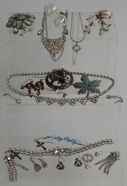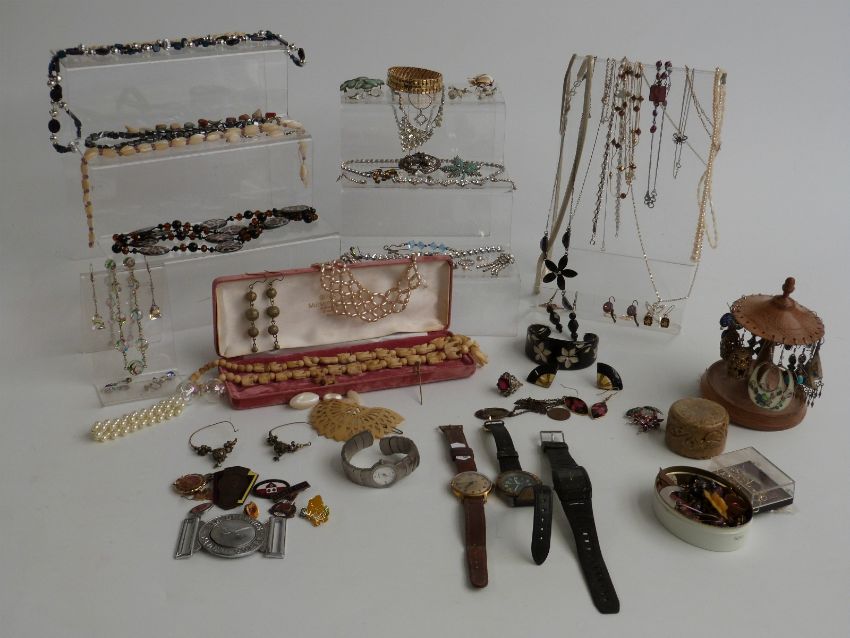 A collection of costume jewellery including brooches, silver earrings, Miracle brooch, necklaces, paste necklace, vintage beads, badges etc