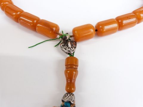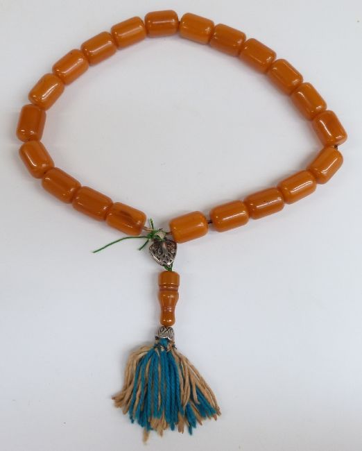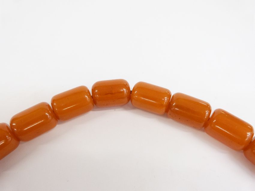 An amber prayer bead necklace of 21 cylindrical beads, each 21.5x15.6mm, with white metal mounts, 115g.