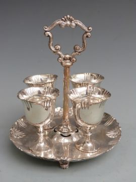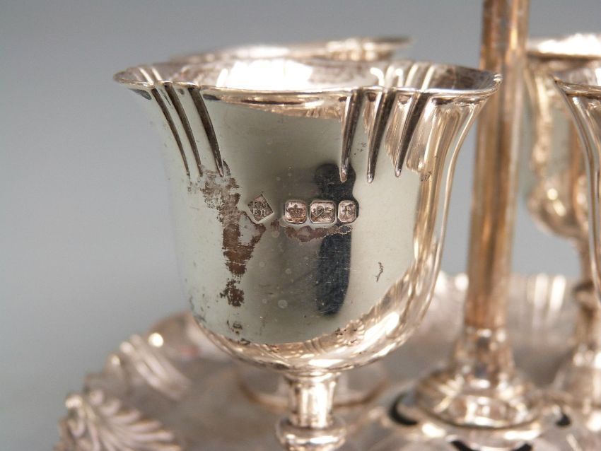 George V hallmarked silver egg stand, Sheffield 1923 maker Martin Hall & Co, egg cups various dates but the same maker, height 17cm weight 510g