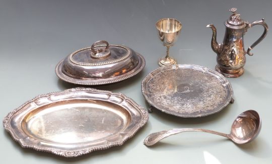 A quantity of silver plate to include salver raised on ball and claw feet, diameter 26cm, Elkington goblet, tray etc
