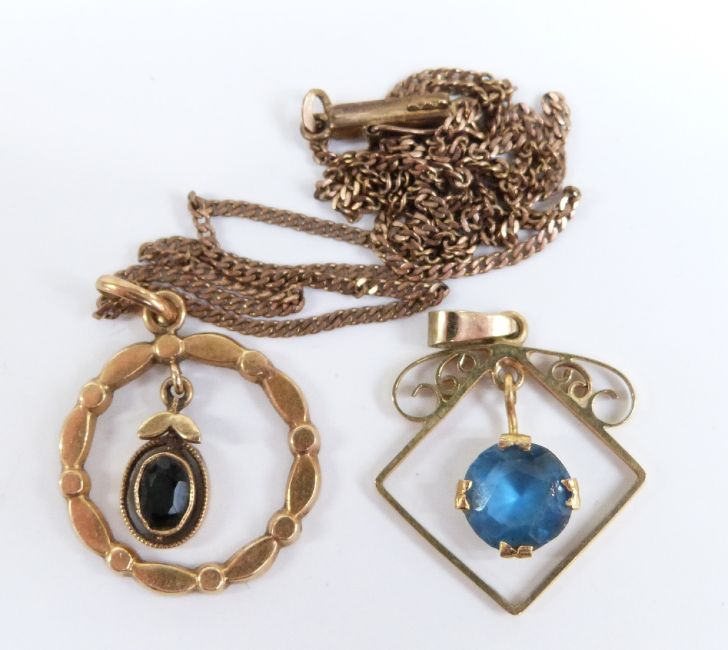 A 14ct gold pendant (1.1g) on a 9ct gold chain and another 9ct gold pendant (2.4g)