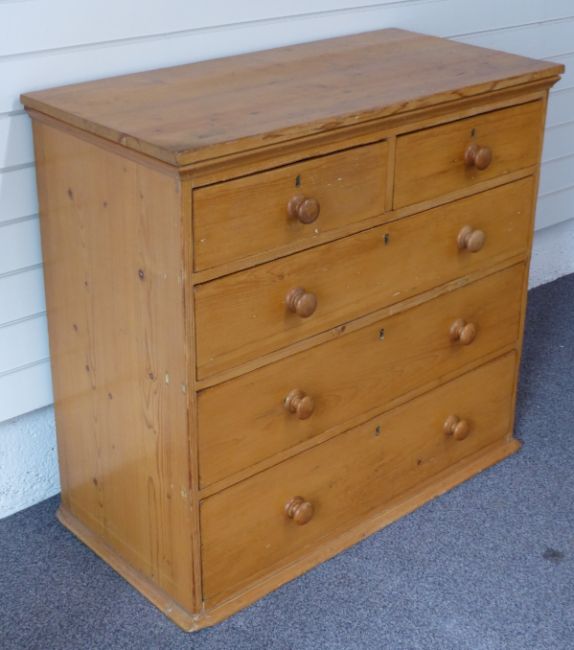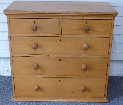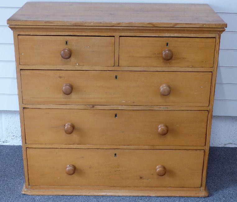 Victorian pine chest of two over three drawers with turned handles, W96 x D47 x H89.5cm