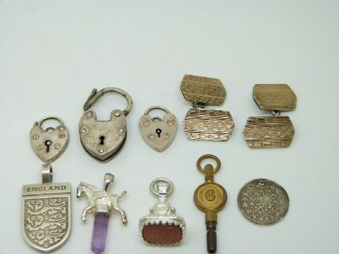 A pair of silver cufflinks, three silver padlocks, silver England pendant, silver pendant, watch key etc