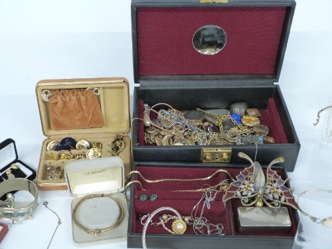 A collection of costume jewellery including vintage earrings, abalone bracelet, necklaces, brooches etc