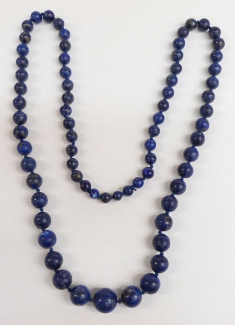A lapis lazuli necklace of 72 graduated carved spherical beads, the largest 16mm in diameter.
