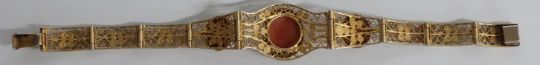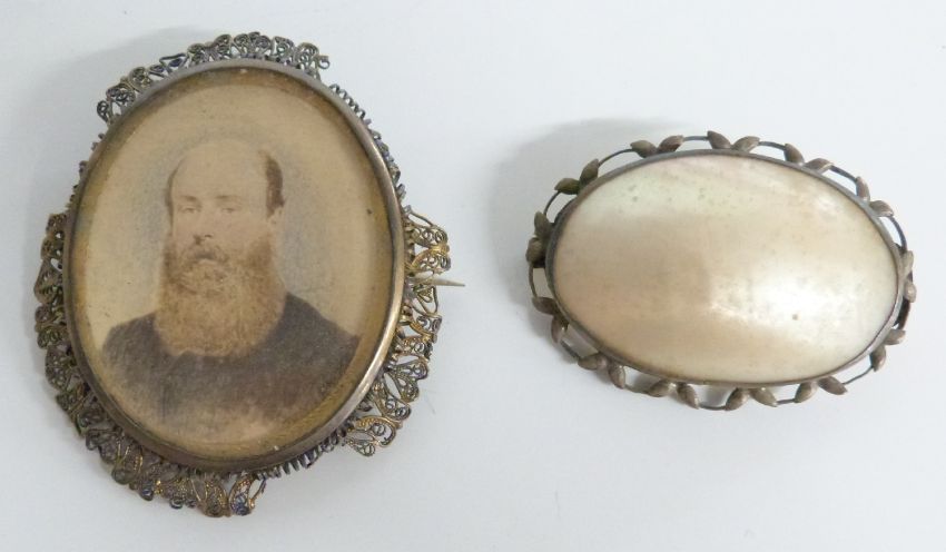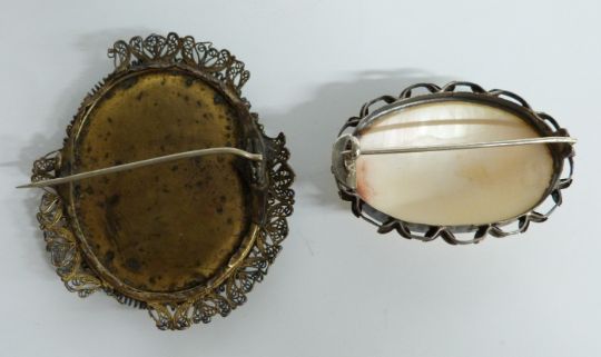 A filigree bracelet set with cameos, a mother of pearl buckle, mother of pearl brooch and a portrait minature