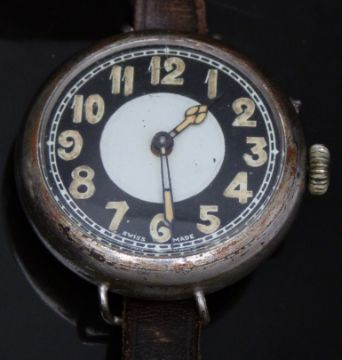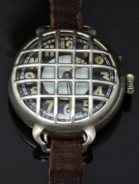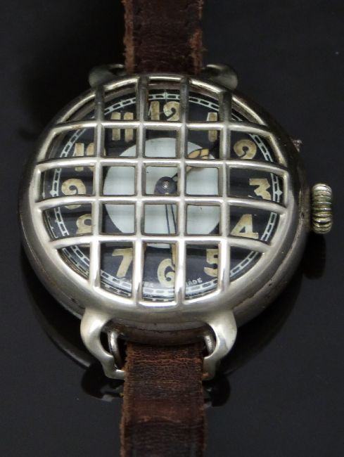 Swiss gentleman's military trench style wristwatch with luminous cathedral hands and markers, two-tone dial, shrapnel guard and wire lugs, on brown leather strap, case diameter 40mm.