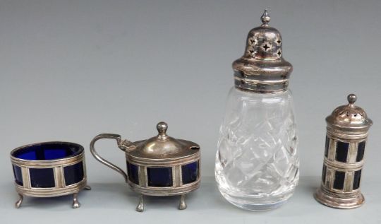George V hallmarked silver three piece cruet set with blue glass liners, Sheffield 1921/2 maker Cooper Brothers & Sons Ltd, weight without liners 96g together with a hallmarked silver mounted cut glass sugar caster height 13cm