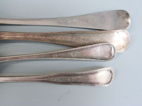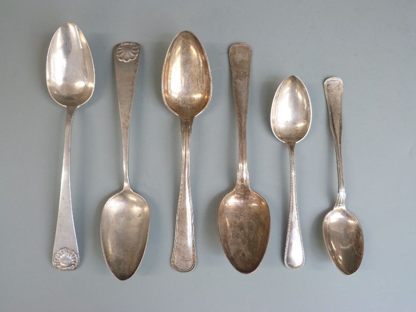 Pair of Danish white metal table spoons, length 22cm, two similar dessert spoons with Danish silver marks for Christian F Heise, weight 213g and a two further possibly white metal spoons, weight 87g