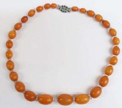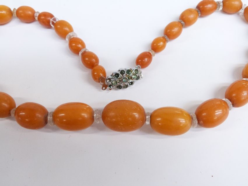 Baltic amber necklace of 28 graduated oval beads, the largest 21.2x15.5mm, interspersed with faceted glass discs, with later paste set clasp, 36g.