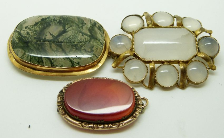 Victorian brooch/ pendant set with agate, a 9ct gold Victorian brooch set with moss agate and a Victorian brooch set with chalcedony