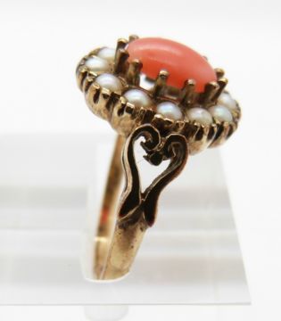 A yellow metal ring set with an oval coral cabochon surrounded by seed pearls, 3.3g, size P