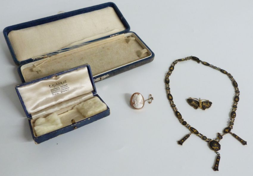 A yellow metal brooch set with a cameo and a Japanese necklace