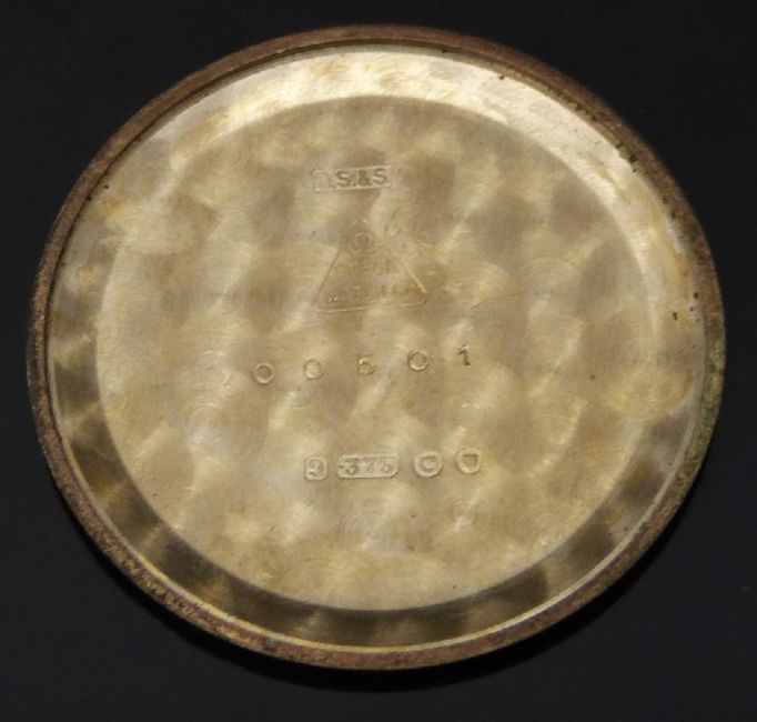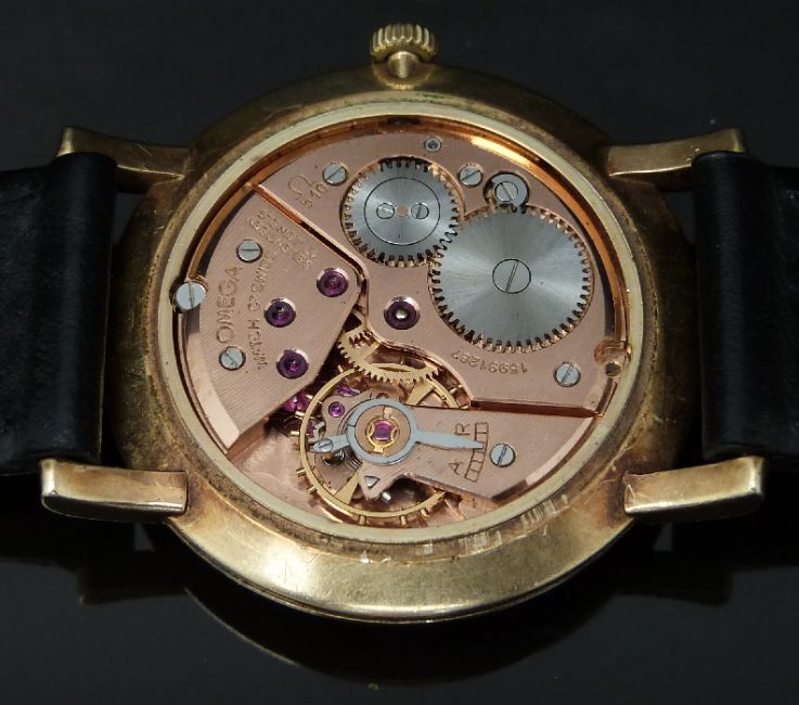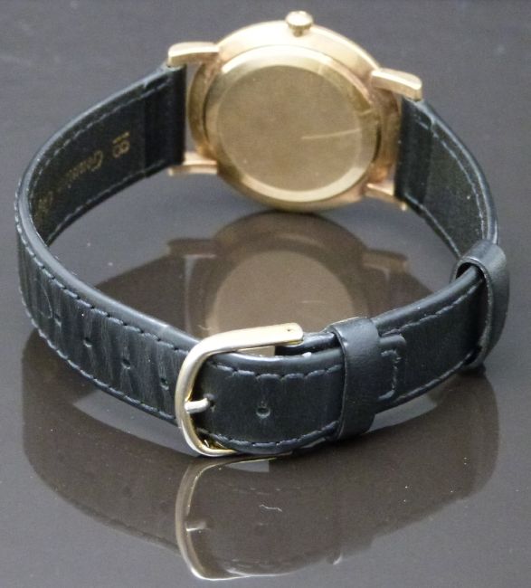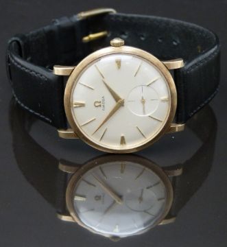 Omega 9ct gold gentleman's wristwatch ref. 00501 with inset subsidiary seconds dial, gold hands and hour markers, silver dial and signed 17 jewel calibre 501 movement, on black leather strap, case diameter 34mm, serial number 15991267, in original display stand box with outer box.