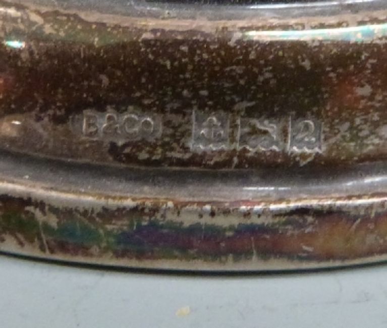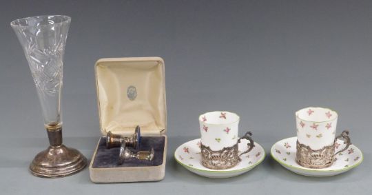 Hallmarked silver mounted cut glass trumpet vase, height 19cm, pair of Edward VII hallmarked silver mounted cups and saucers, Birmingham 1907 maker William Comyns & Sons Ltd and a cased pair of small hallmarked silver candlesticks