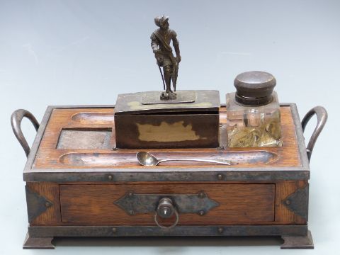 Silver plated Art Nouveau desk stand, width 29.5cm, and a hallmarked silver salt spoon