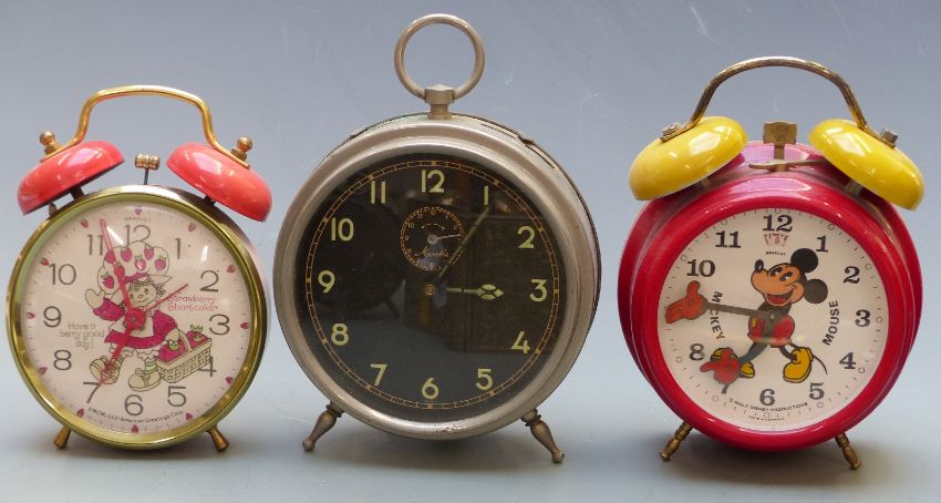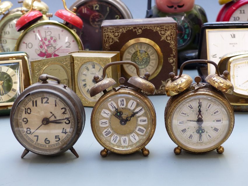 A large collection of alarm clocks etc to include novelty examples, travel alarms, Estyma, Westclox, Swiza etc