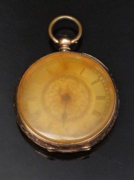 14ct gold open faced ladies pocket watch with blued hand, black Roman numerals, engraved self coloured dial, engraved case and unsigned movement, case diameter 37mm, serial number 23054, 36g.