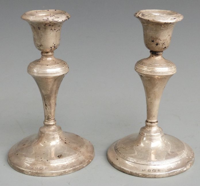 Pair of George V hallmarked silver  candlesticks, Birmingham 1912 maker W J Myatt & Co, height 12.5cm