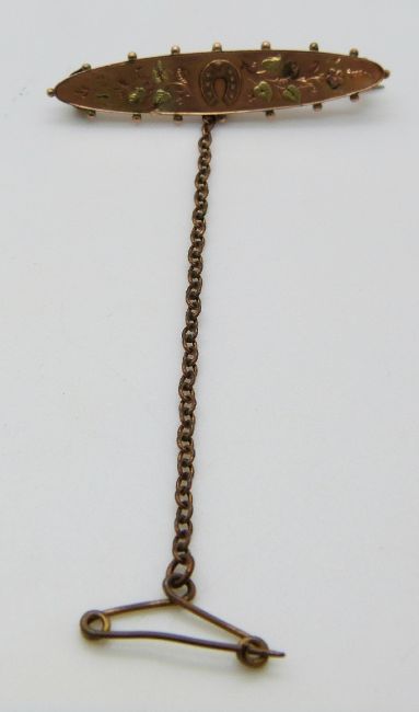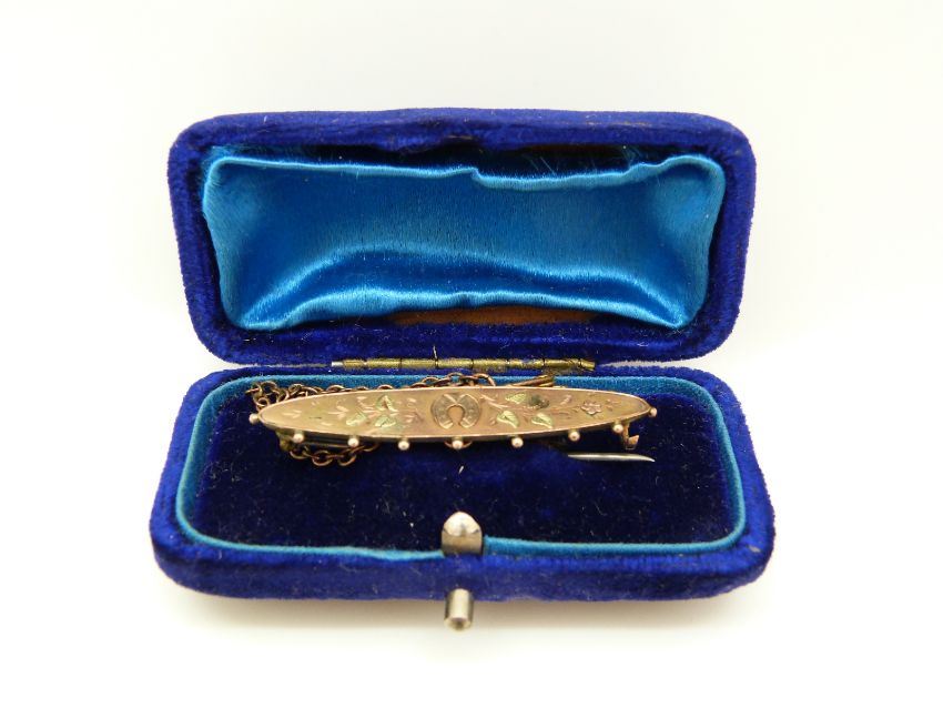 Victorian 9ct gold brooch with horseshoe and foliate decoration, Chester 1899, in original box