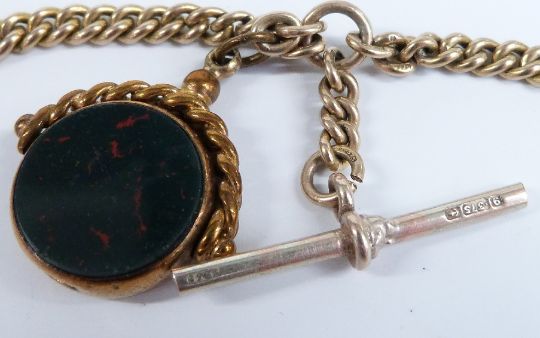 Victorian 9ct gold double Albert with a gold plated fob, 30g, 36cm