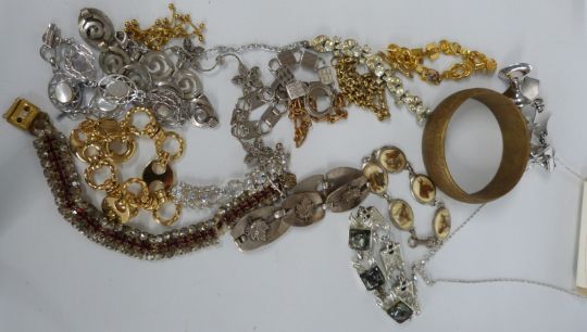 A collection of costume jewellery including bangles, Coro bracelet, watches, Marcel Drucker watch, etc