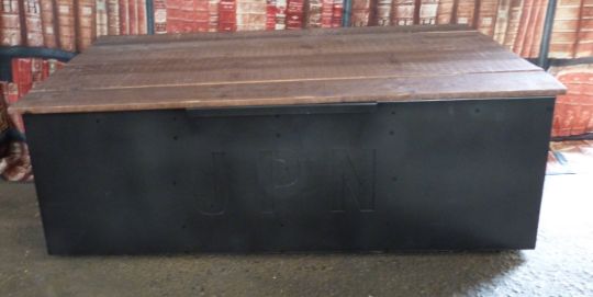 Industrial/haberdashery/shopfitting ammunition box style twin handled metal trunk with hinged plank top lid suitable as a coffee table, W125 x D79 x H42cm