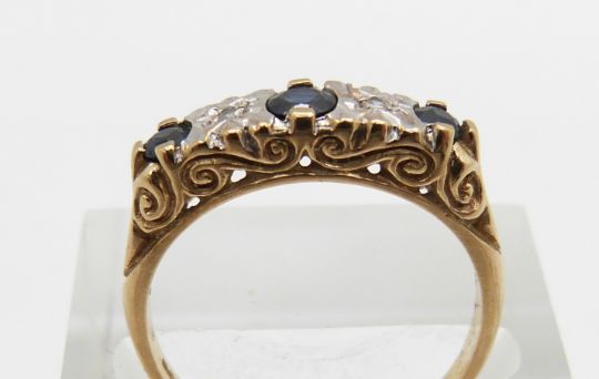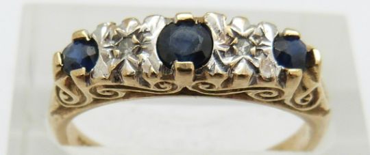 A 9ct gold ring set with three sapphires and diamonds, 2.6g, size O