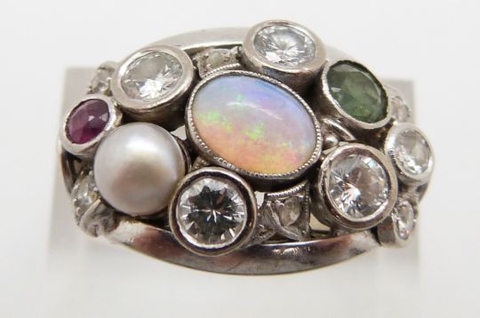 An 18ct white gold ring set with four round cut diamonds, each approximately 0.2ct, six further diamonds, an oval opal cabochon, a round cut tourmaline, a ruby and a pearl, 8.2g, size M