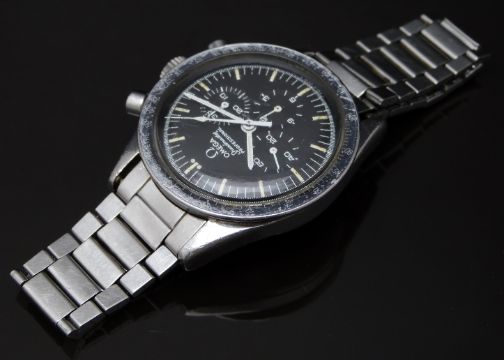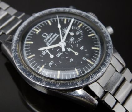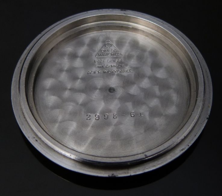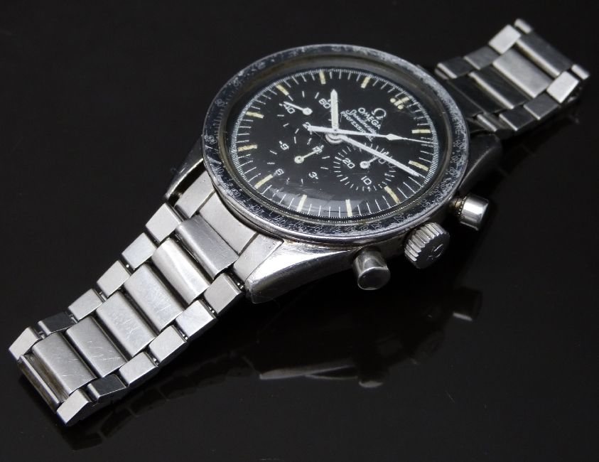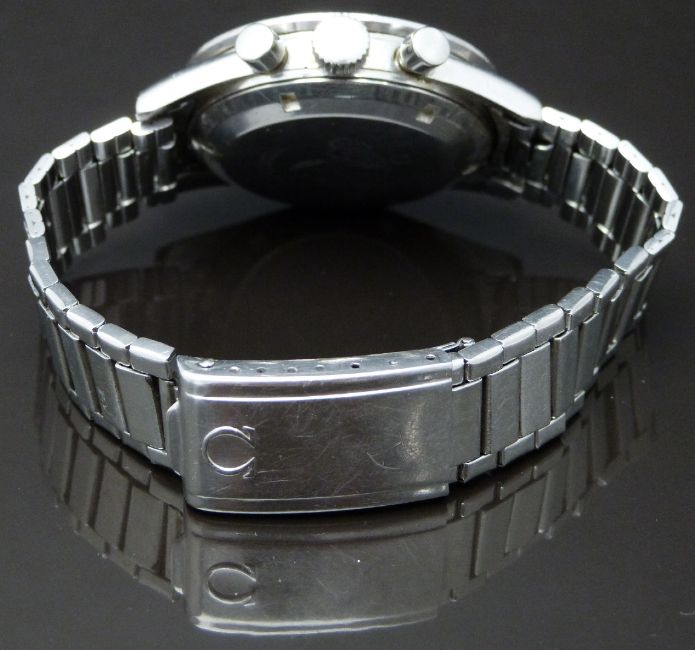 Omega Speedmaster gentleman's chronograph wristwatch ref. 2998-61 with dot over 90 (DO90) tachymetre bezel, black service dial, luminous hands and markers, stainless steel case, straight lugs and 17 jewel calibre 861 movement, on stainless steel 1039 bracelet, case diameter 38mm, serial number 31316117.