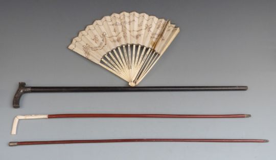 19thC carved bone fan with neoclassical swag decoration and carved bone handled stick, white metal handled walking stick and a swagger stick